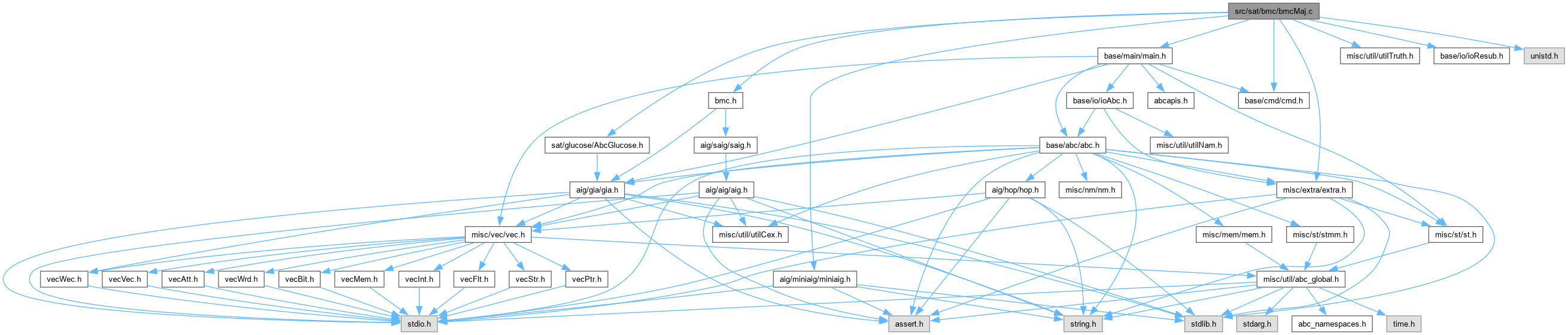 #include "bmc.h"#include "misc/extra/extra.h"#include "misc/util/utilTruth.h"#include "sat/glucose/AbcGlucose.h"#include "aig/miniaig/miniaig.h"#include "base/io/ioResub.h"#include "base/main/main.h"#include "base/cmd/cmd.h"#include <unistd.h>